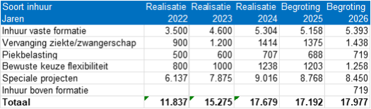 In de begroting 2026 gaan we uit van een vergelijkbaar inhuurvolume als 2025. In de eerste tussentijdse rapportage is een verwachte realisatie van €17,3 miljoen opgenomen. In de begroting is dit bedrag geïndexeerd met 4% prijsstijging.