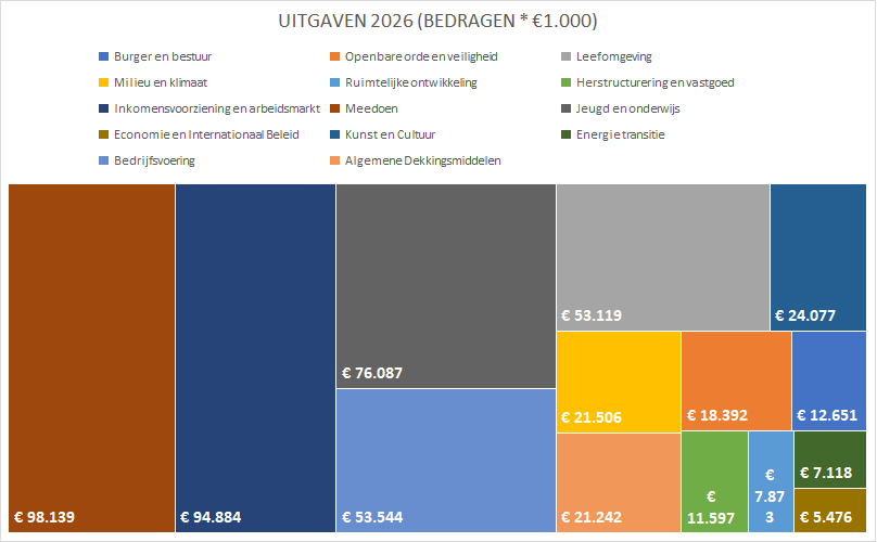 In 2026 geeft de gemeente een bedrag van €484,5 miljoen uit aan de verschillende werkzaamheden, exclusief de algemene middelen en inclusief stortingen in reserves. In onderstaande tabel is weergegeven hoeveel de uitgaven per programma bedragen. De lasten van de algemene dekkingsmiddelen, inclusief stortingen in reserves bedragen €21,2 miljoen. Voor een toelichting op dit programma wordt verwezen naar Programma Algemene dekkingsmiddelen. De totale lasten van de gemeente bedragen €505,7 miljoen.