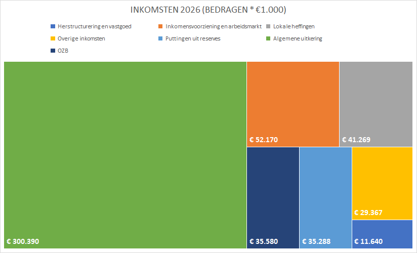 Onderstaande figuur geeft de inkomsten uit de verschillende bronnen schematisch weer. De totale inkomsten van de gemeente bedragen €505,7 miljoen. Hiervan wordt €35,2 miljoen geput uit reserves.